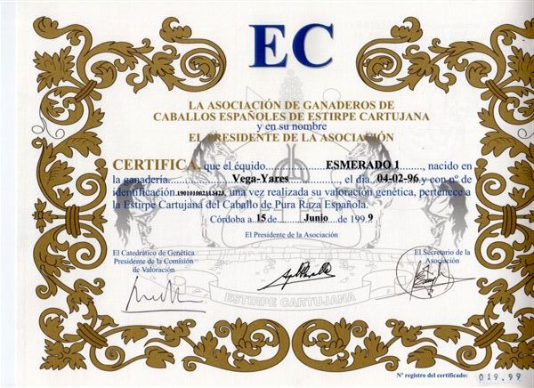 Von Quimico II aus der Esmerada III von Ganador XII. Reiner Cartujano-Schimmel aus der Lumbreras-Zucht. Esmerado ist im Juli 2024 im Alter von 28 Jahren auf der Weide verstorben.
