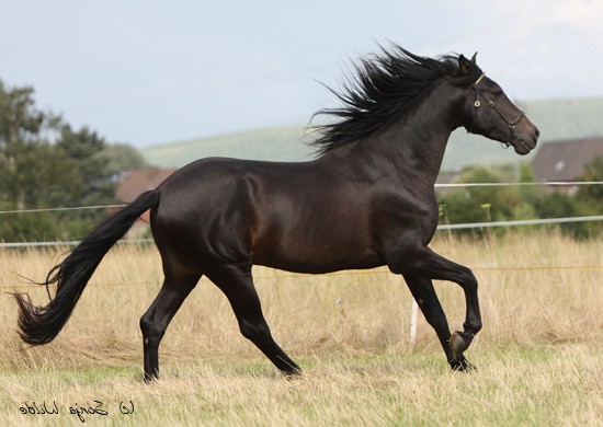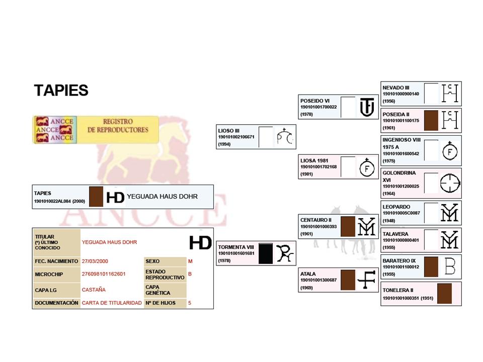 TAPIES wurde klassisch dressurmäßig ausgebildet und seit 2004 mit großem Erfolg als Deckhengst eingesetzt. Er vererbt sicher seine glänzend schwarz-braune Jacke und seine Größe (zwei seiner Söhne wurden über 1,70 m!). Ebenso haben seine Nachkommen das überdurchschnittliche Gangpotenzial seiner Eltern: URANA war als 3-jährige Bewegungssiegerin in Murcia und LIOSO III wurde bei der Körung mit Bestnoten (3 mal 9!) ausgezeichnet.